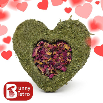 Made from all natural, tasty ingredients, our Valentine's Feast is sure to make your rabbit's heart jump. This forage treat is made from dried grass and parsley stalks, bound together with our vegan edible binder to make this extra cute heart shape. Finally, it is filled with colourful, tasty rose petals that your bunny will adore.